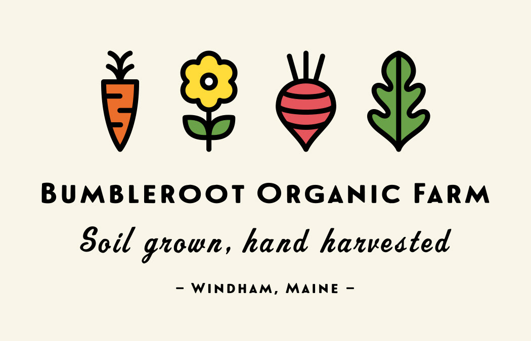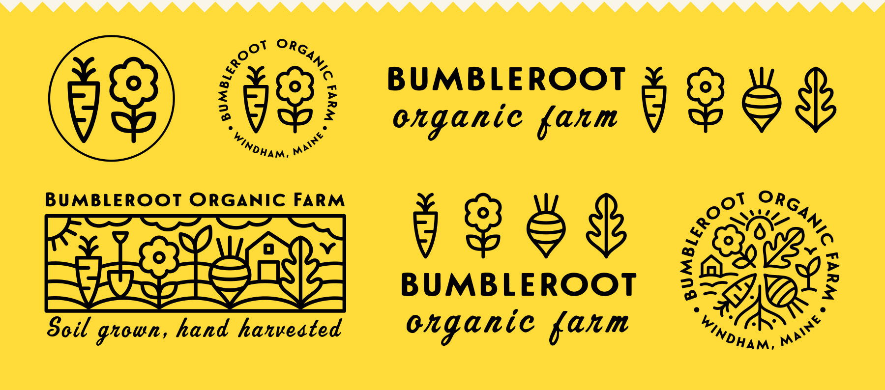 Logo + identity design for Bumbleroot Organic Farm, featuring graphics that are cute yet strong + fitting to their name. The simple, clean lines from the logo art were also extended throughout the brand's identity.