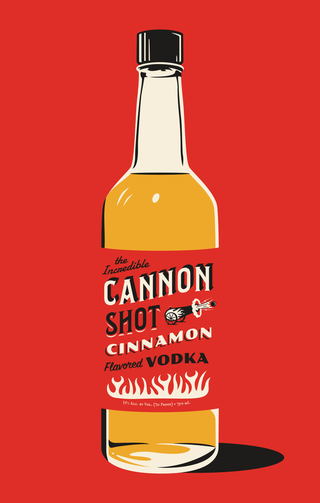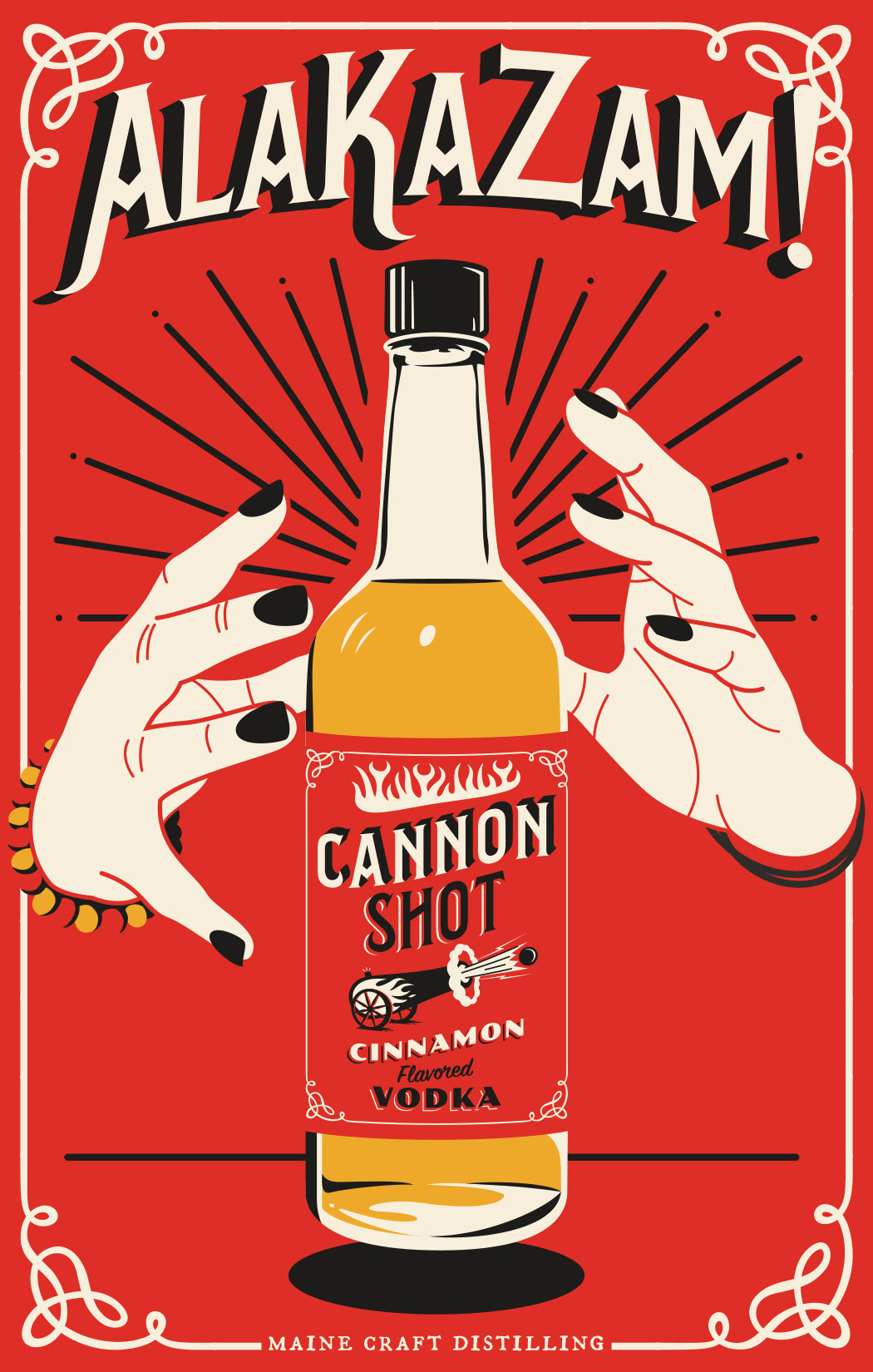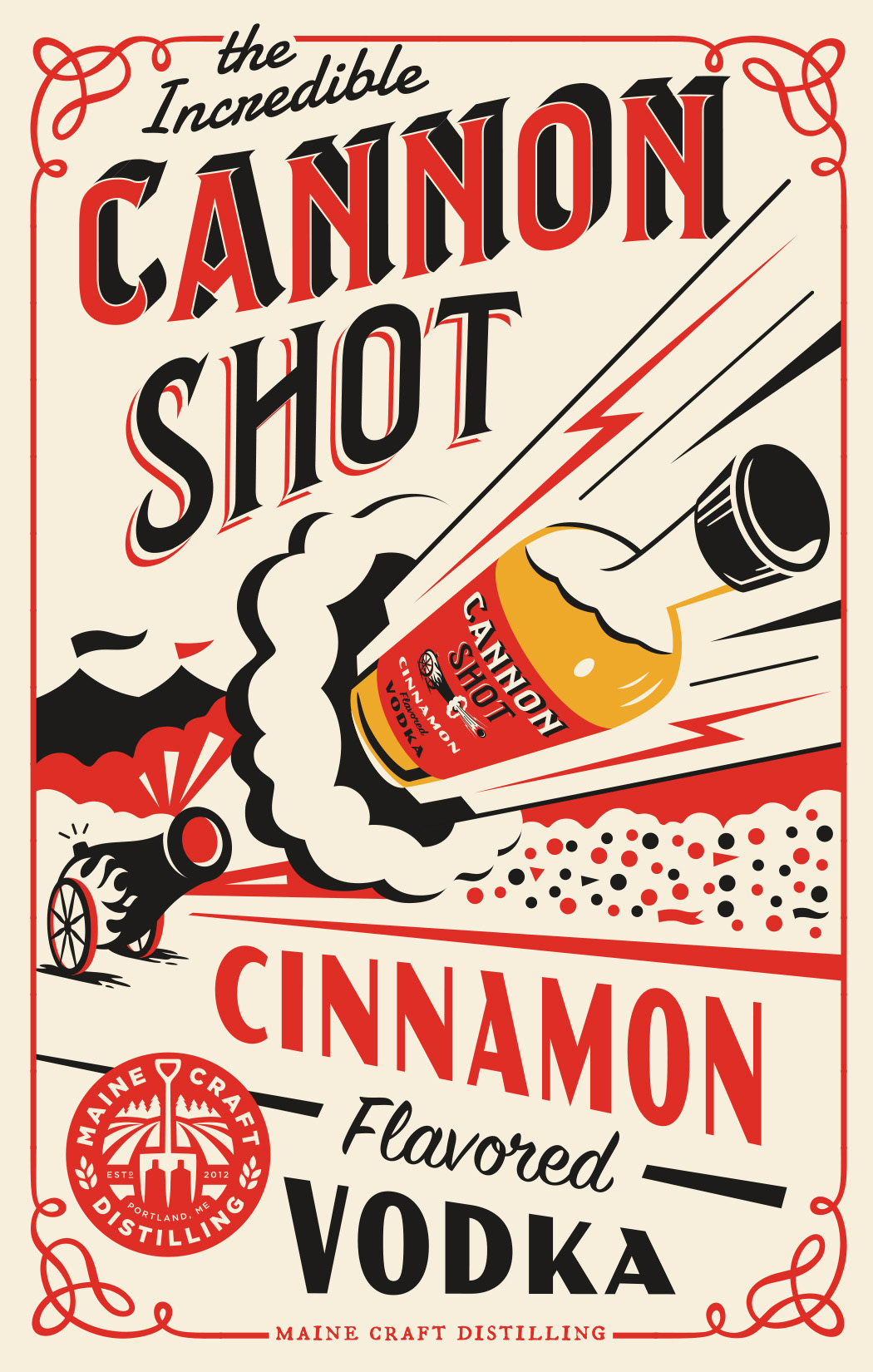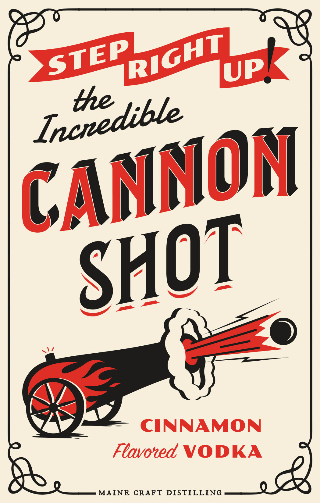 Artwork for Maine Craft Distilling's Cannonshot Vodka brand, featuring vintage carnival-inspired designs and illustrations.