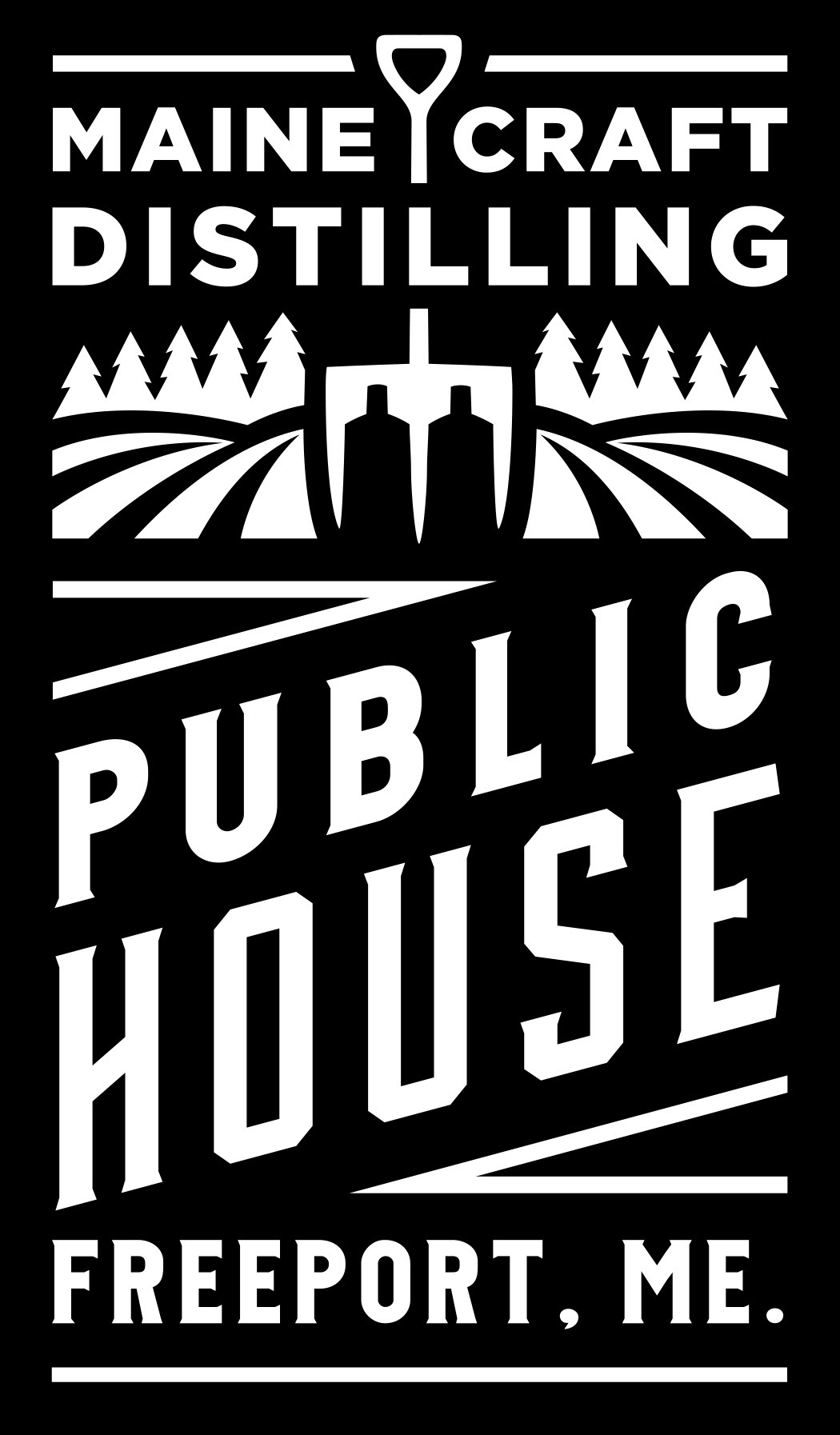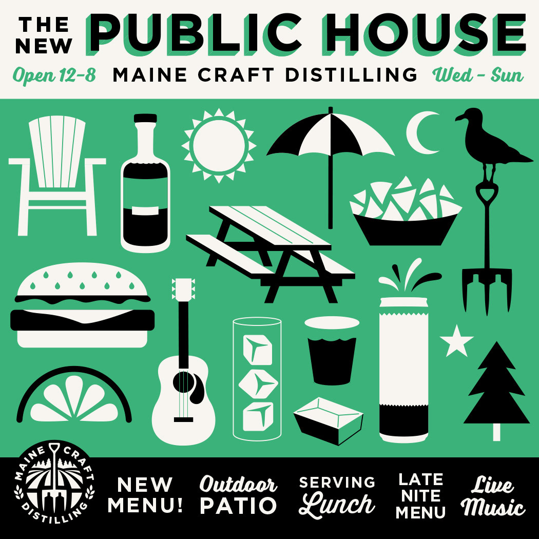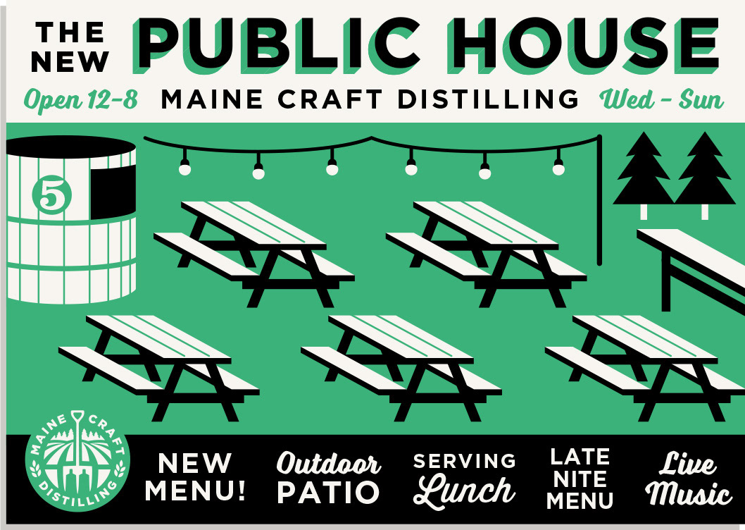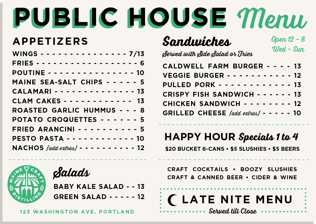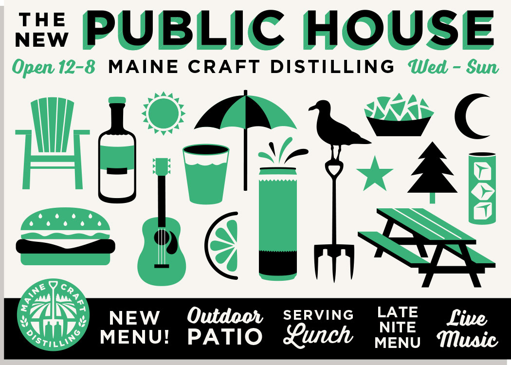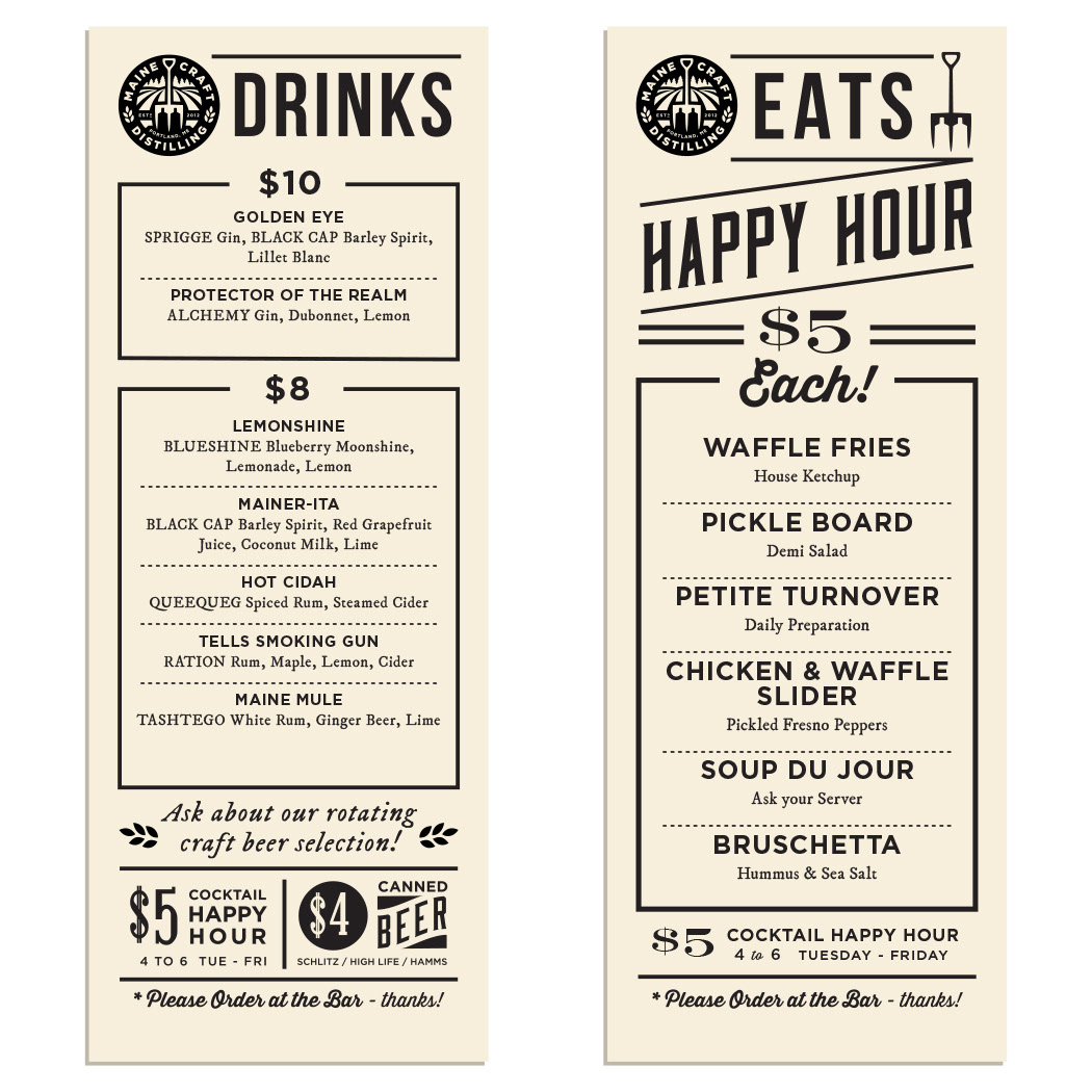 Menu designs and graphics for The Public House at Maine Craft Distilling in both Freeport + Portland.