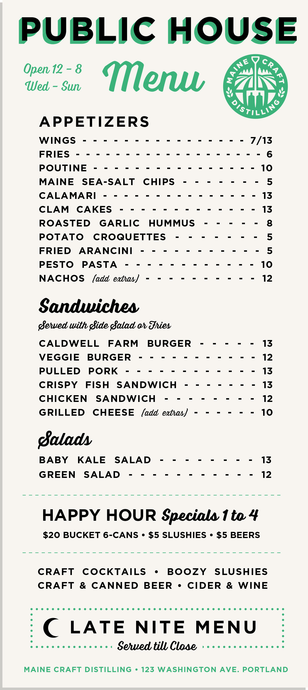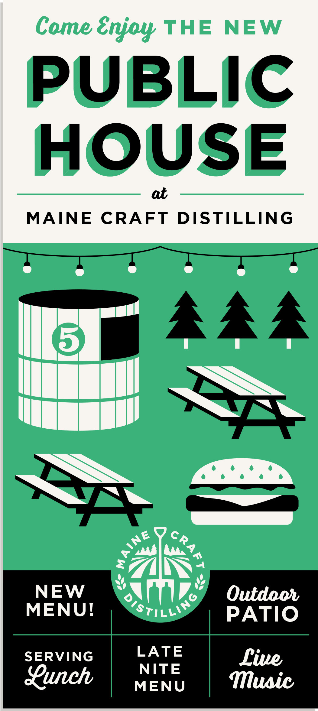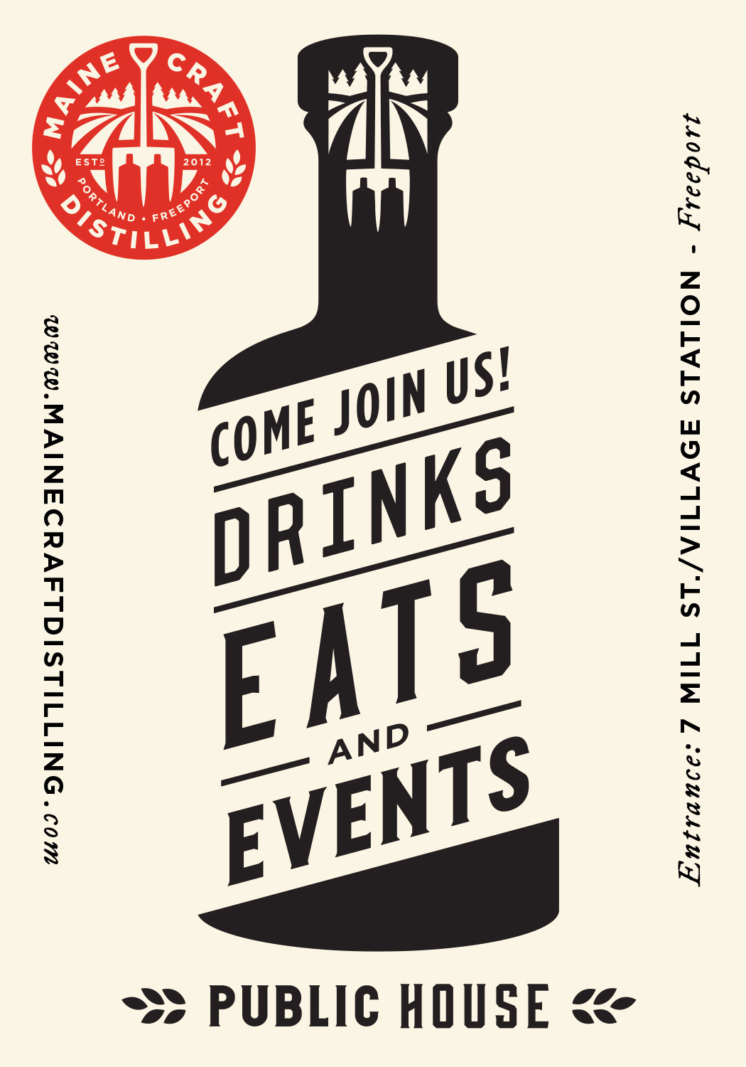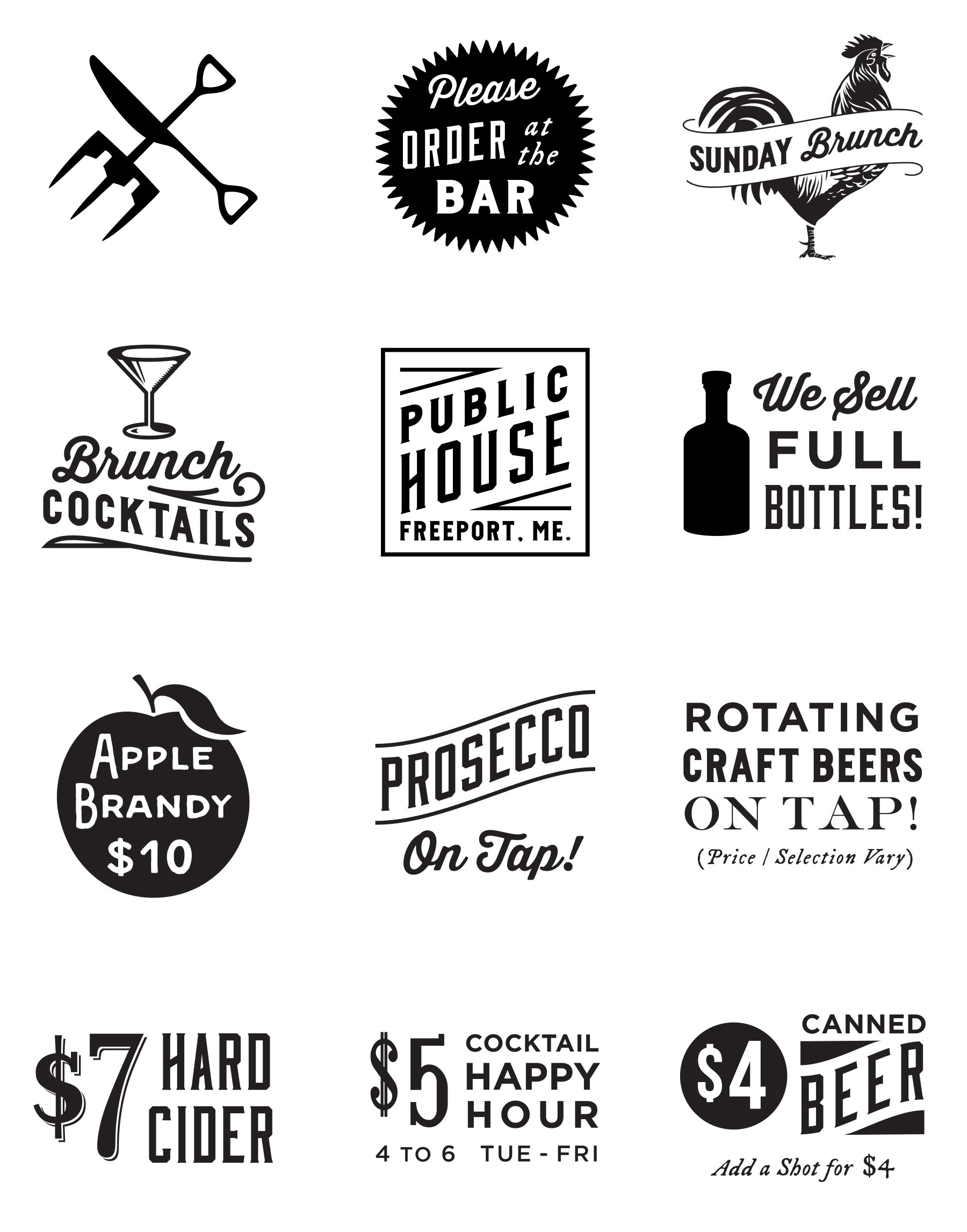 Menu designs and graphics for The Public House at Maine Craft Distilling in both Freeport + Portland.